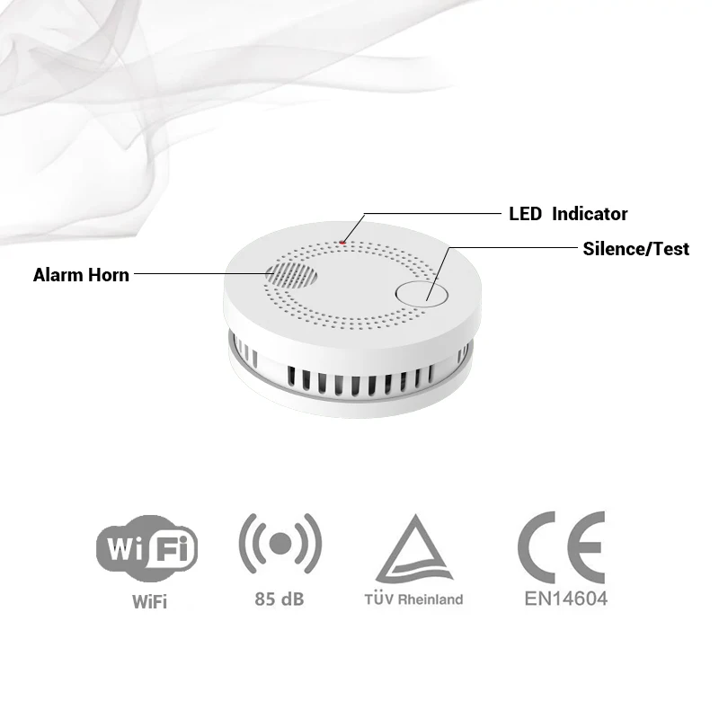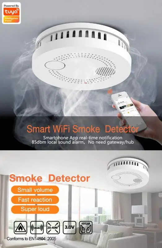 This product is an intelligent photoelectric smoke detector. Low power consumption and high security detector. It can detect smoke in real time, emit light and sound to alert. Working with the Tuya APP, it can push alarm messages to mobile APP remotely and timely, allows you to take measures in time to tackle with the dangerous case.