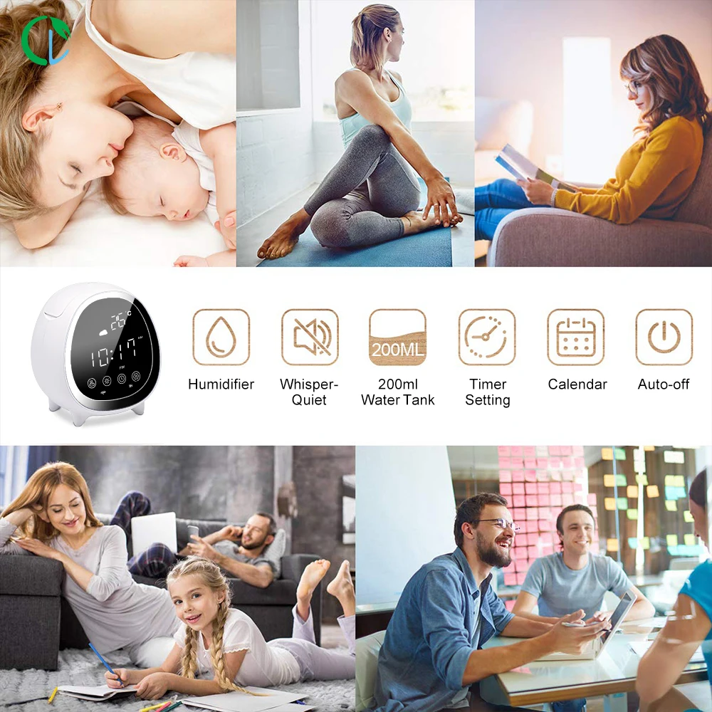 Clock Settings --have a good sleep, the intelligent WiFi aroma diffuser mist maker will wake you up. (touch anywhere of the unit will stop the clock alarming)